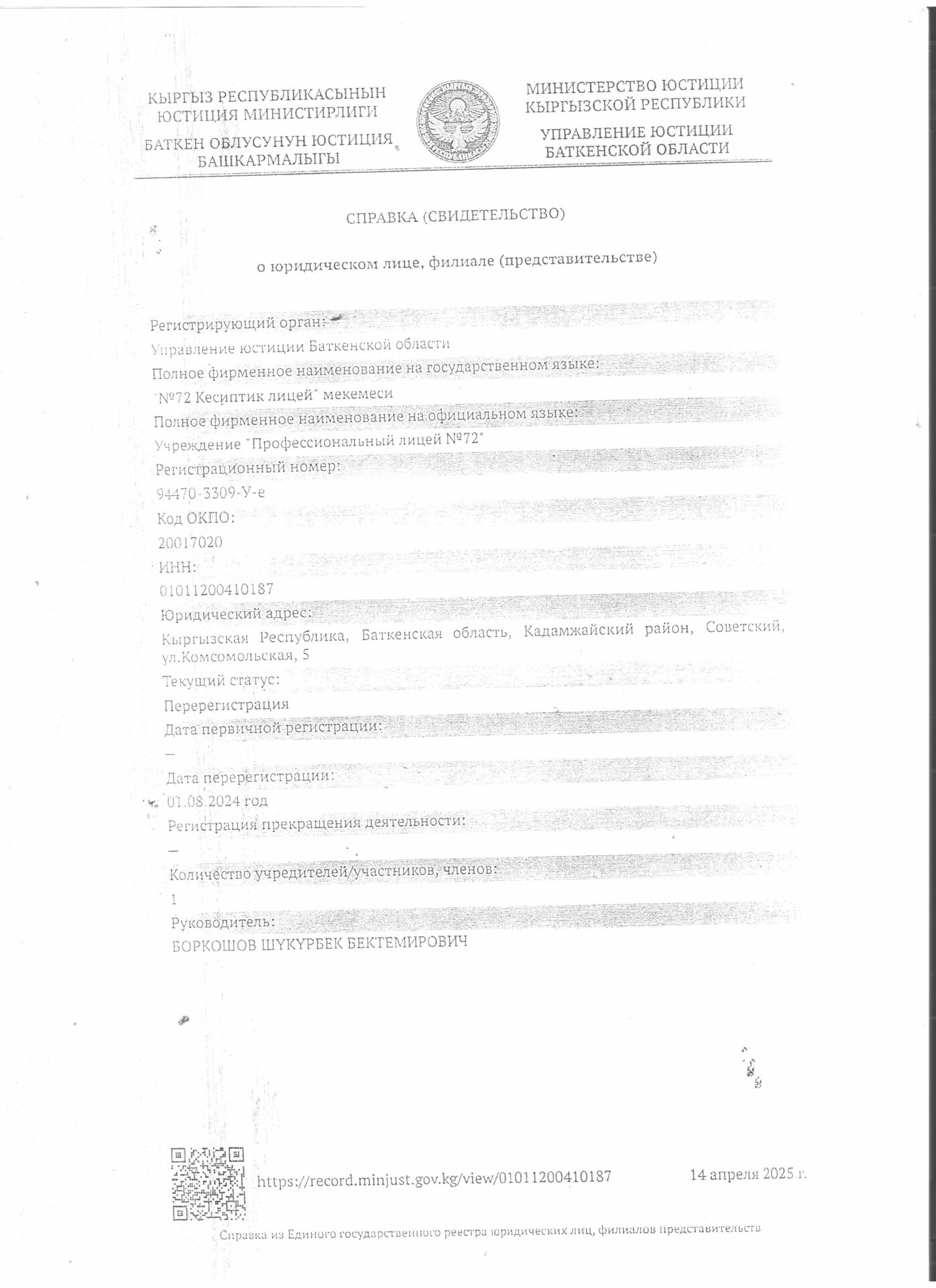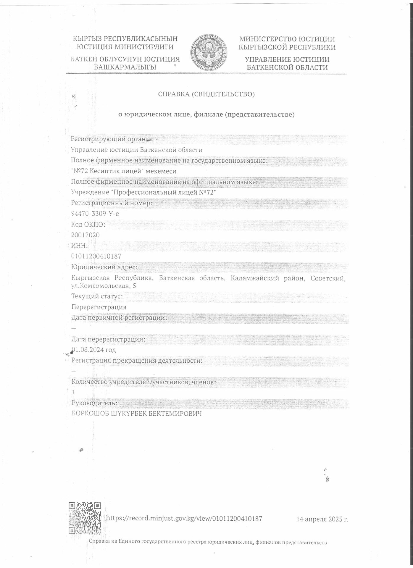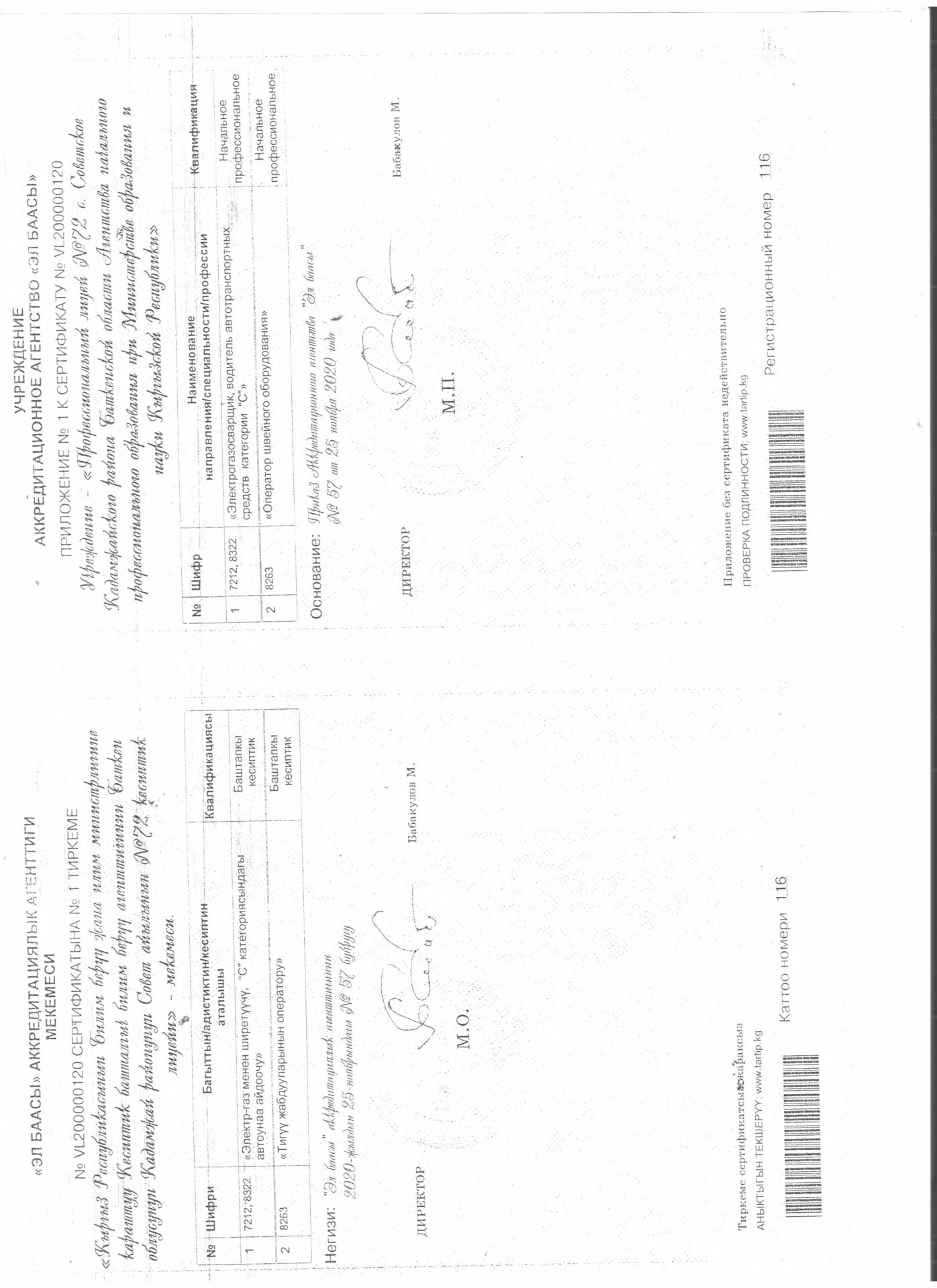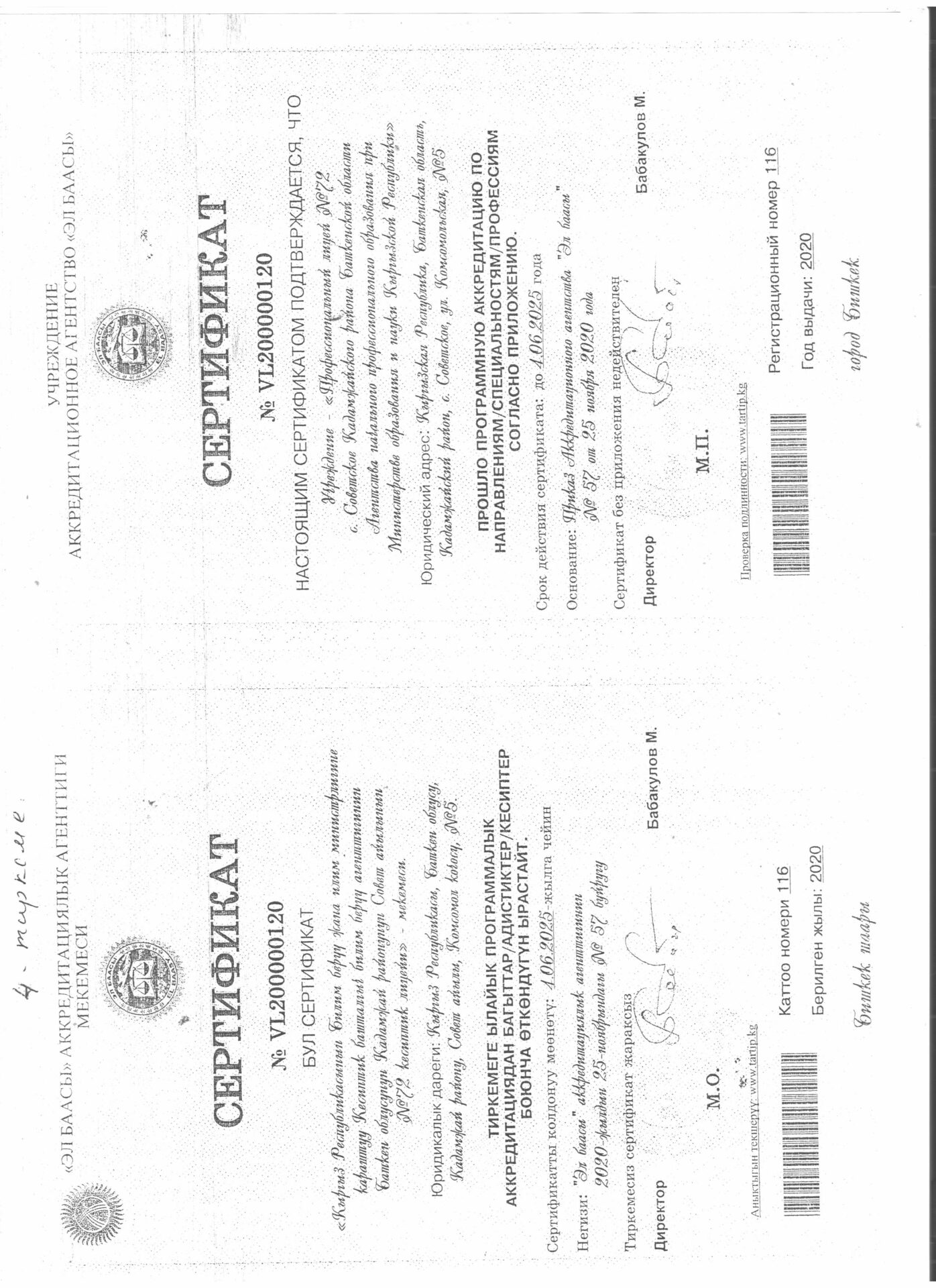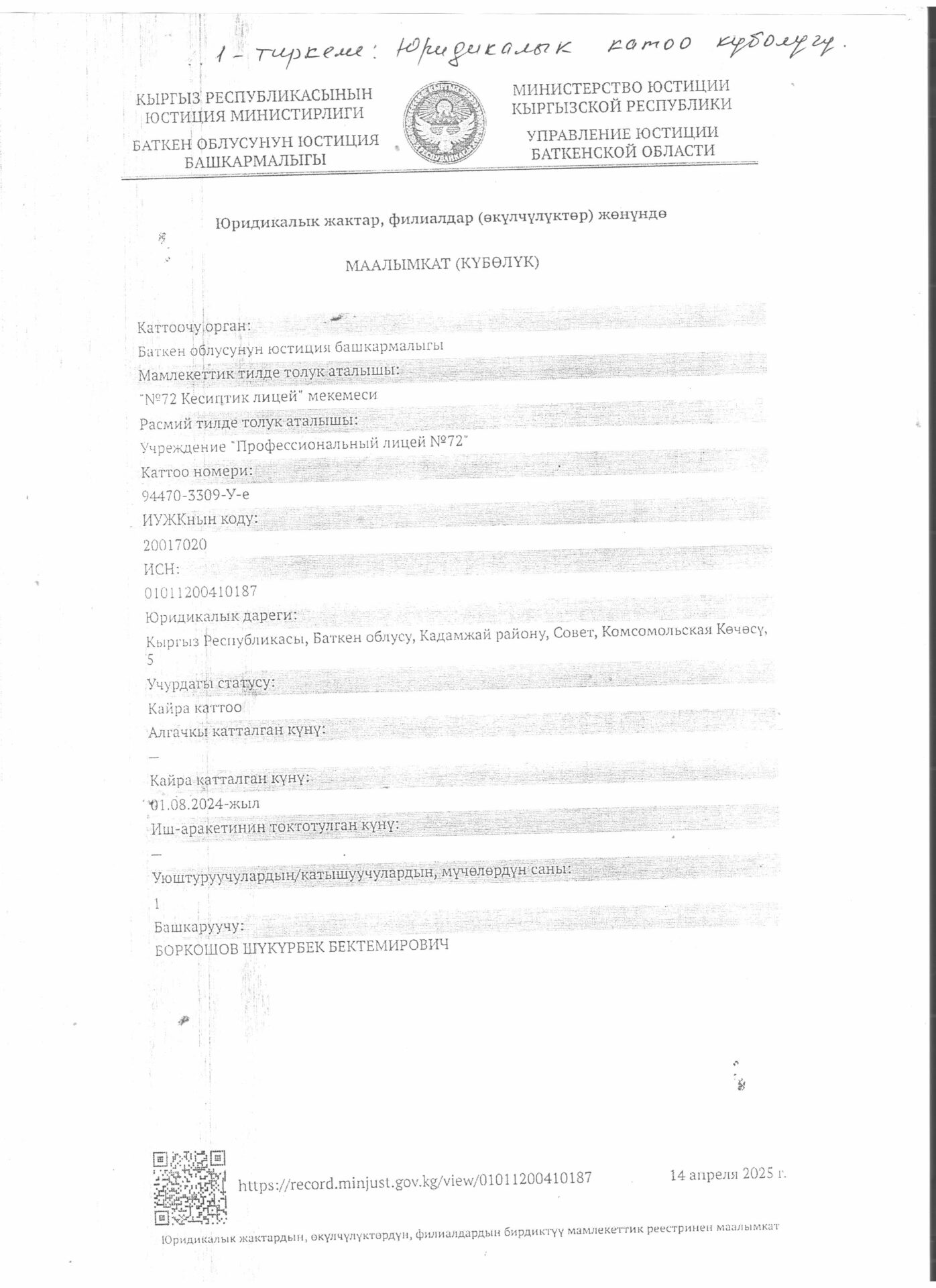 1 тиркеме Юридикалык күбөлүгү
